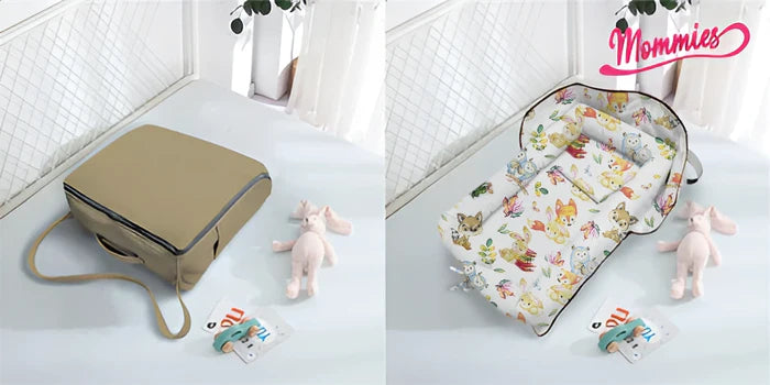 Un alt avantaj al pătuțului portabil pentru bebeluși Mommies este că are spațiu pentru biberon, iepurașul de jucărie, păturica de dormit, astfel încât să fii sigur că găsești totul într-un singur loc.